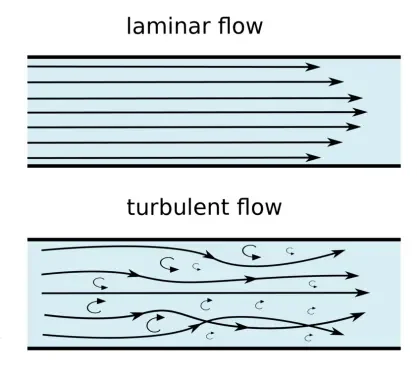 Figure 2: Laminar flow versus turbulent flow. While illustrated for water in a pipe, the same concept applies for wind flowing through the atmosphere.