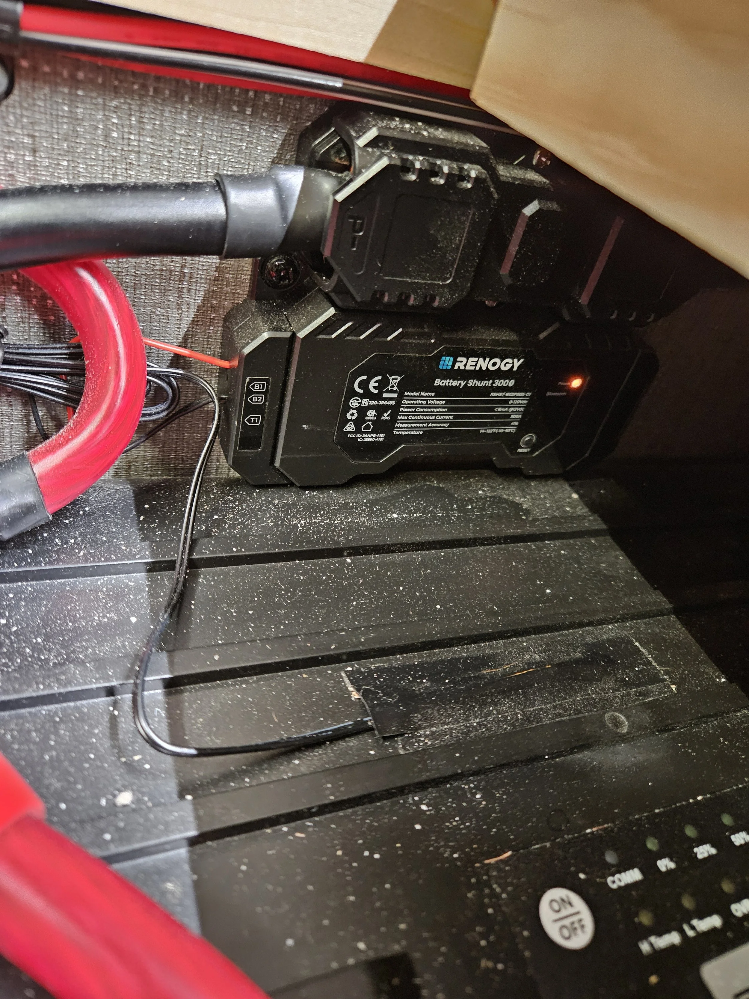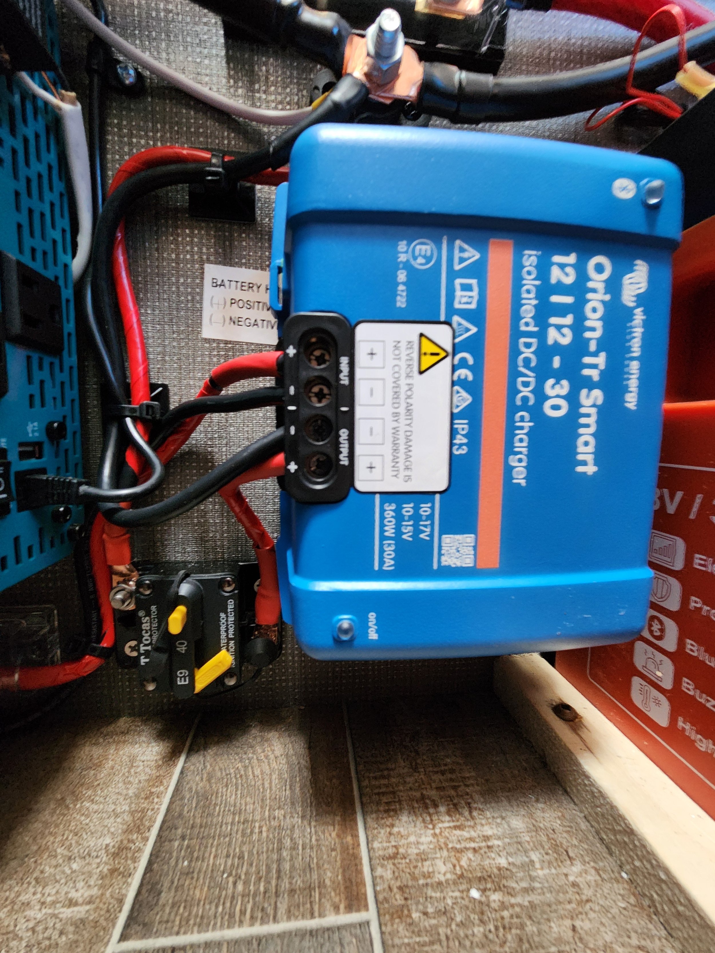 The space was tight, but luckily we could fit the charger in sideways with room for wiring. If I had any bigger of hands, I probably wouldn’t have been able to wire it all together! But with a bit of patience, I was able to fit an input fuse, output circuit breaker, and all wiring in place without it looking like a mess! Its always a humble reminder that those picture-perfect van-build electrical systems don’t consider space constraints when modifying an existing system.