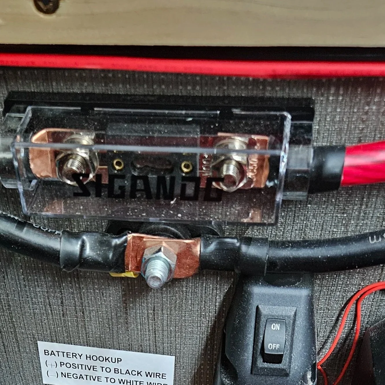 Second? An oversized fuse. Its hard to tell from the picture but that is a 400A ANL fuse. While it might stop a short circuit, this fuse is far too big to prevent an overload from user-error. Push 2000W continuously through a 3KW inverter with a space heater, and nothing would stop the wire from melting or causing a fire!