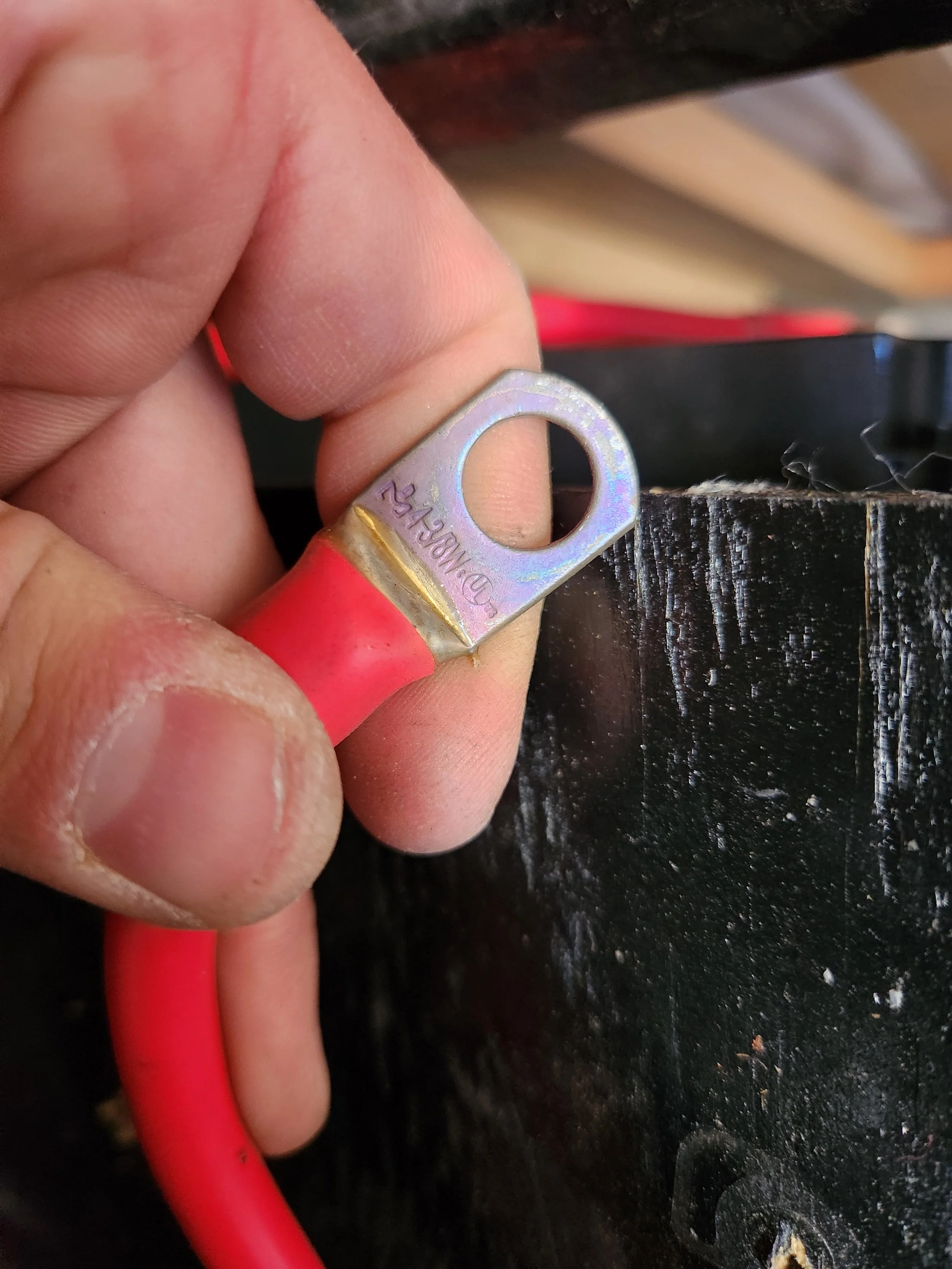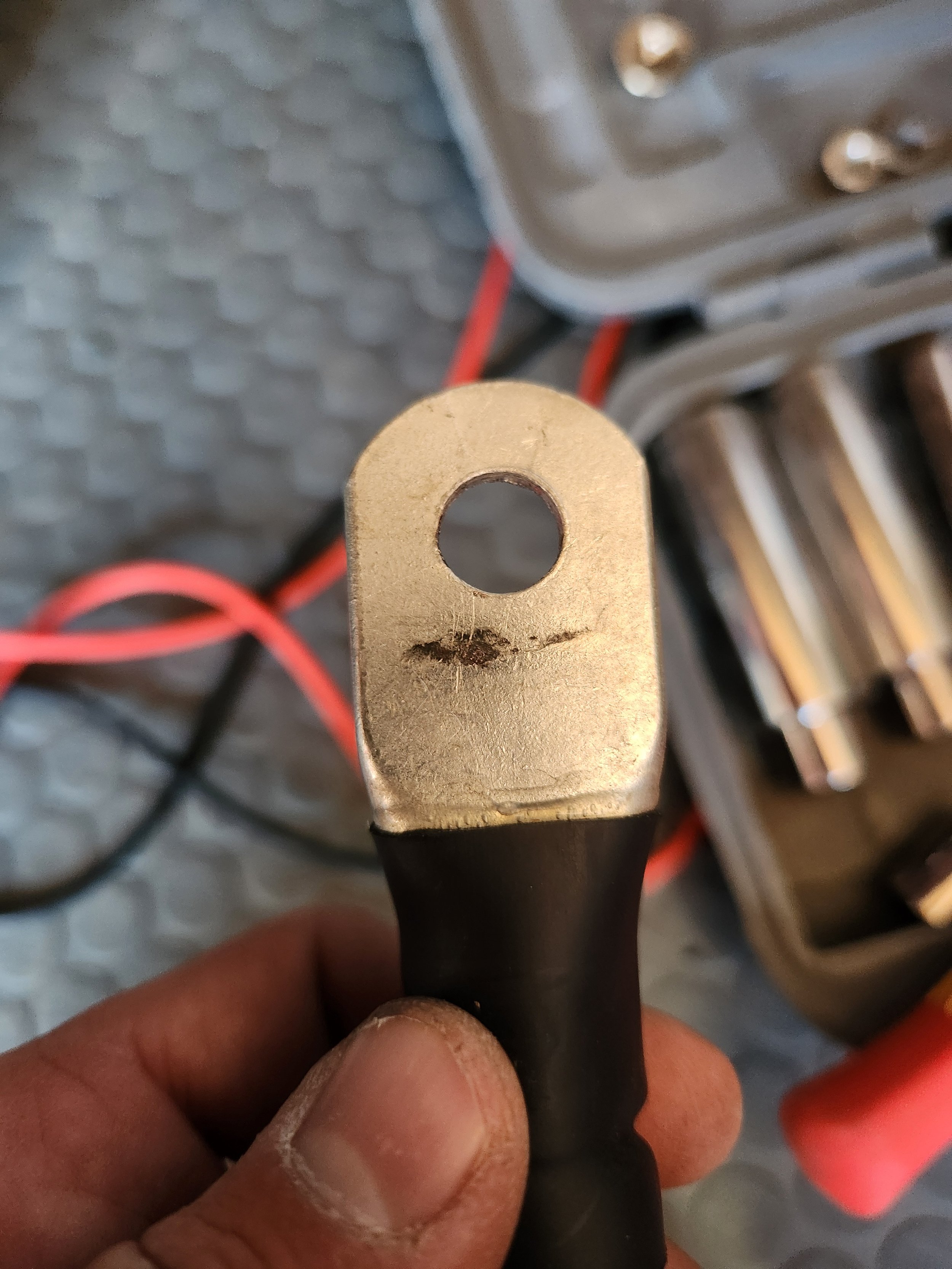 The sound I had heard was electrical arcing, which occurs when current tries to bridge a gap between two conductors through air. Arcing creates a ton of heat in a very short time, and can easily combust nearby materials. Luckily, I had better hardware on hand to provide a more secure connection, and the lugs on either side of the arc were not badly damaged. A quick wire brushing and retorquing, and the arcing problem was solved. But this wasn’t the only issue.