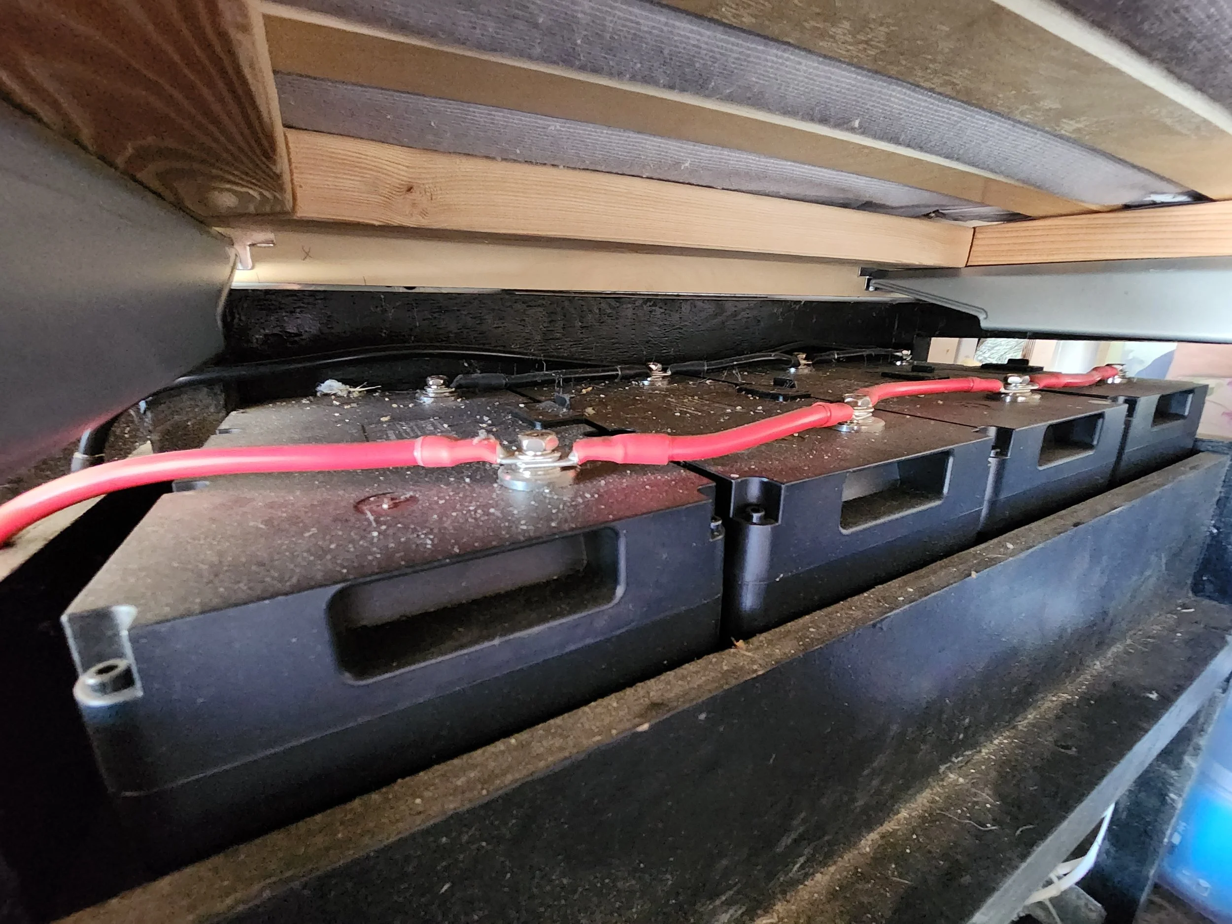 So with these 3 issues now identified, here’s what we did. We extended 4/0 cable from the distribution bus bars to some new battery bus bars. We used 4AWG wire from these bus bars to each individual battery, as this allows equal current-sharing from each battery. We also removed a few washers that had previously been installed between the bus bars and the copper lugs, as this was another source of heat and power loss.